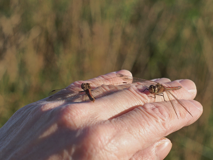 Может быть, стрекозы-одни из самых дружелюбных по отношению к человеку, представителей макромира. Во всяком случае, погреться в лучах солнца на теле человека любят, в чем я убеждался неоднократно. В тот холодный и ветреный, но солнечный день, выйдя из тенистого подлеска на прилегающее к нему поле, я был удивлён количеством стрекоз, которые прилетели погреться ко мне. По две-три уселись мне на руки, и ещё четыре-пять-на куртку. Они улетали совсем недалеко и ненадолго, и сделав небольшой круг, снова усаживались на меня. Мои телодвижения их не пугали и не смущали, что позволило немного поснимать их.