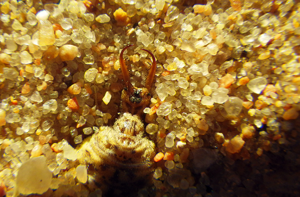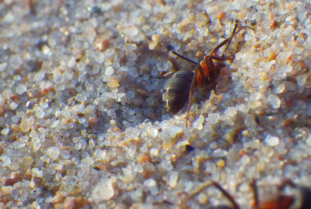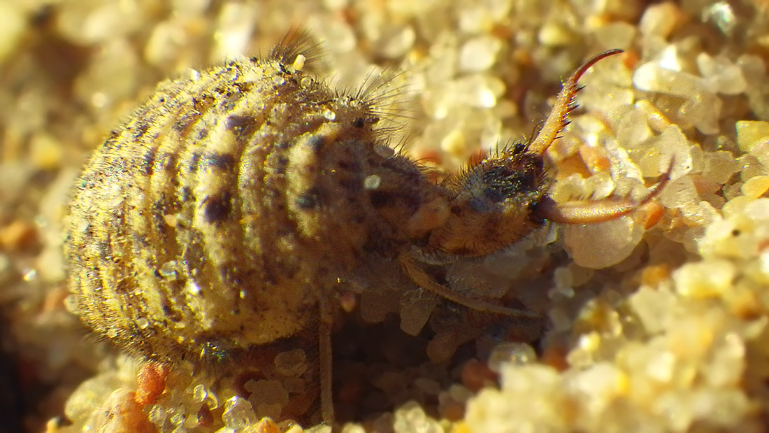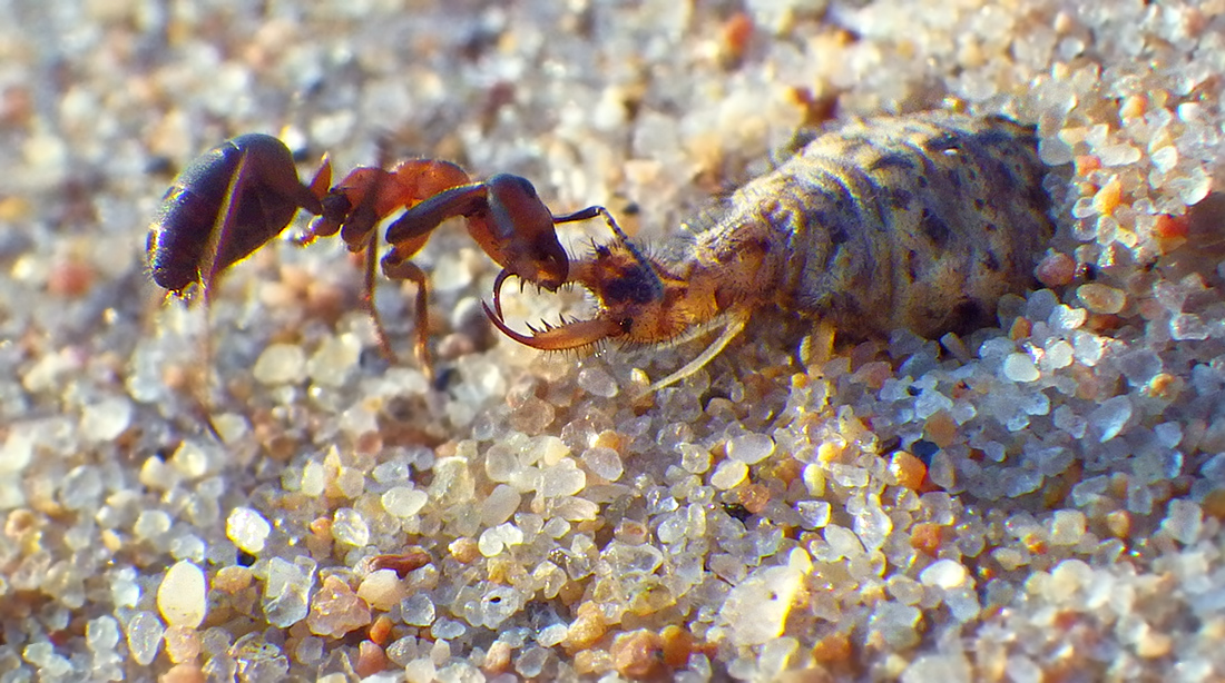 Но потом муравьиный лев опомнился и стал быстро зарываться в песок, утягивая за собой упрямого муравьишку, который даже перед угрозой гибели не разжал челюстей.