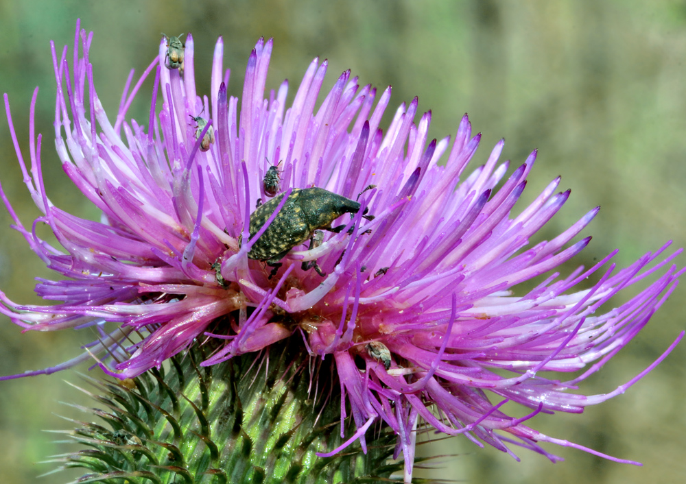 Зерновки на цветке чертополоха. Сидели все почему-то на одном кусту, хотя вокруг было целое поле таких же растений.