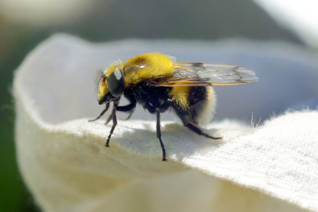Эта муха с чудесным названием Шмелевидная шмелевидка, настолько верит в свою похожесть на шмеля, что стала невероятно смелой. Вот она ходит по рубашке, ощупывая ее своим смешным хоботком. Можно поднести к ней руку и даже совершенно спокойно погладить по пушистой спинке, это не вызывает у нее никаких эмоций. Жаль, конечно, что она не мурчит от подобной ласки, но и так это выглядит забавно.