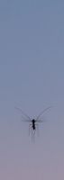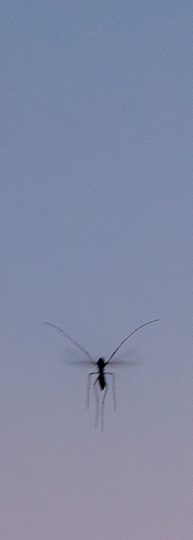 Рой мелких комариков в лучах закатного солнца, снято с относительно длинной выдержкой - здесь 1/6 с. Отдельный летящий комар снят чуть позже, после заката.