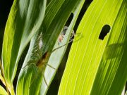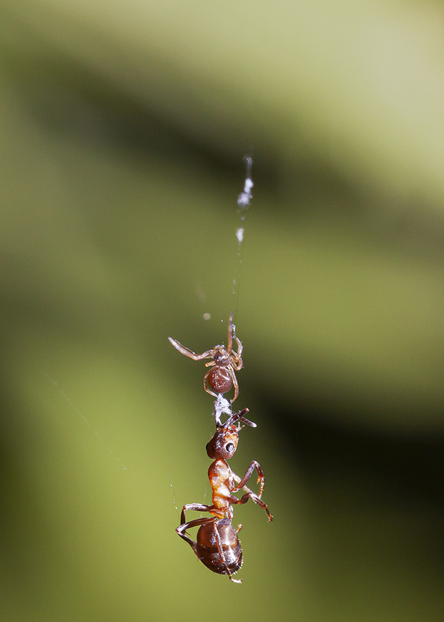 Эти мелкие паучки, похоже, специализируются на муравьях Formica. Прежде они, только взрослые, встречались мне весной, и почти в таких же обстоятельствах - с убитым муравьем, подвешенным на раскачивающейся при малейшем движении воздуха паутинке и "целующие" муравья в голову. А рядом на веточках суетятся, пасут тлей, другие муравьи - их потенциальные жертвы.