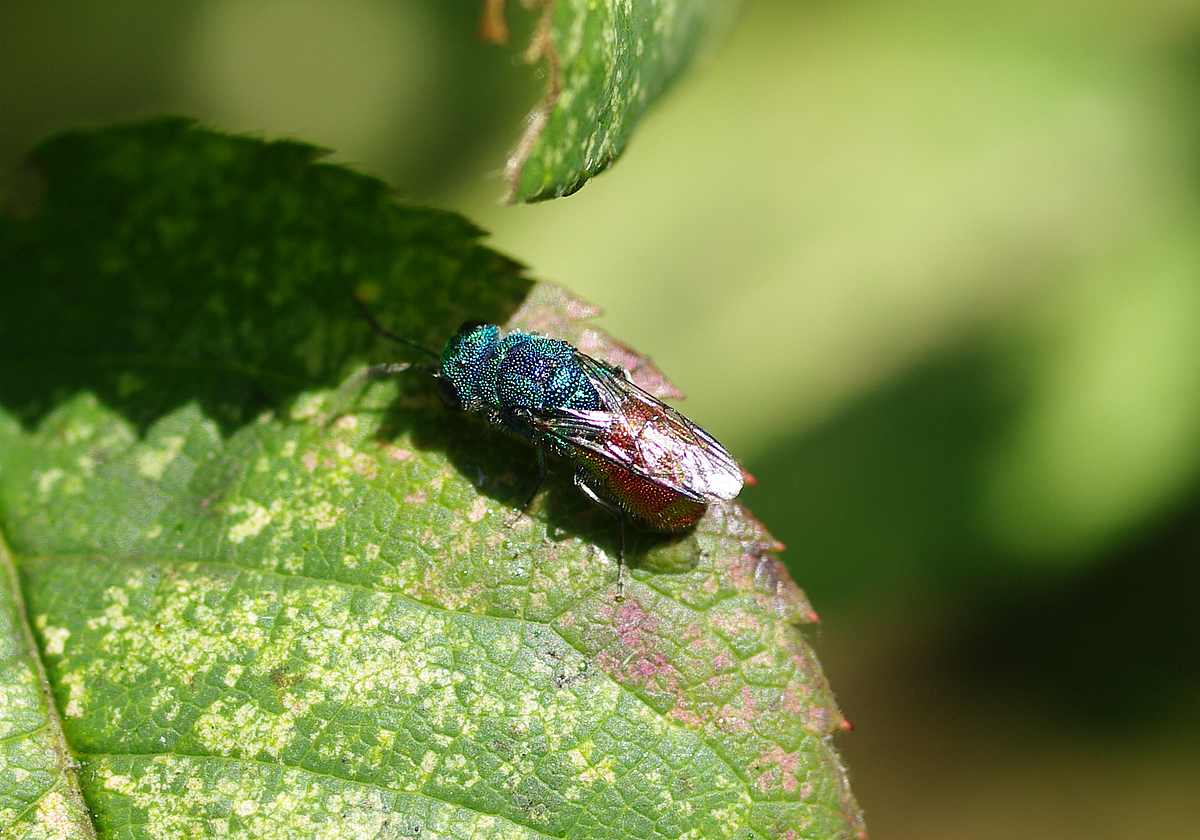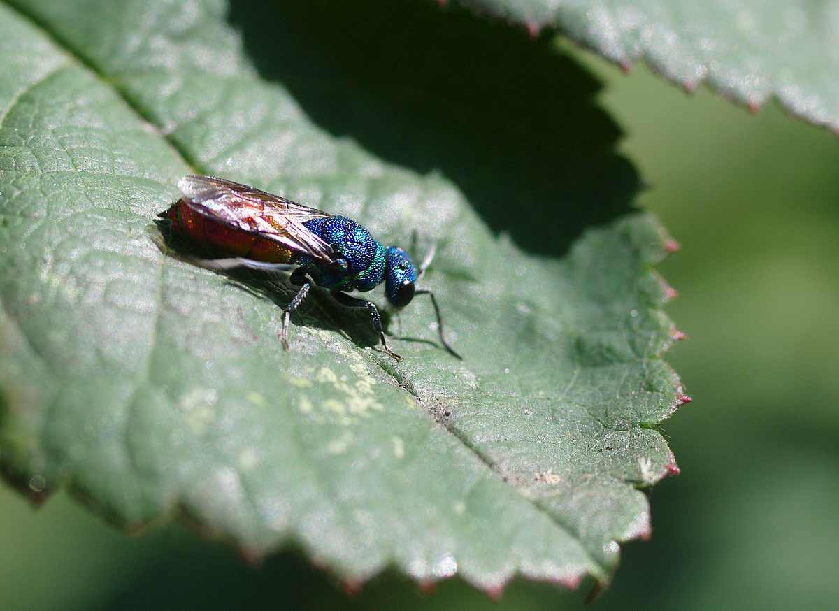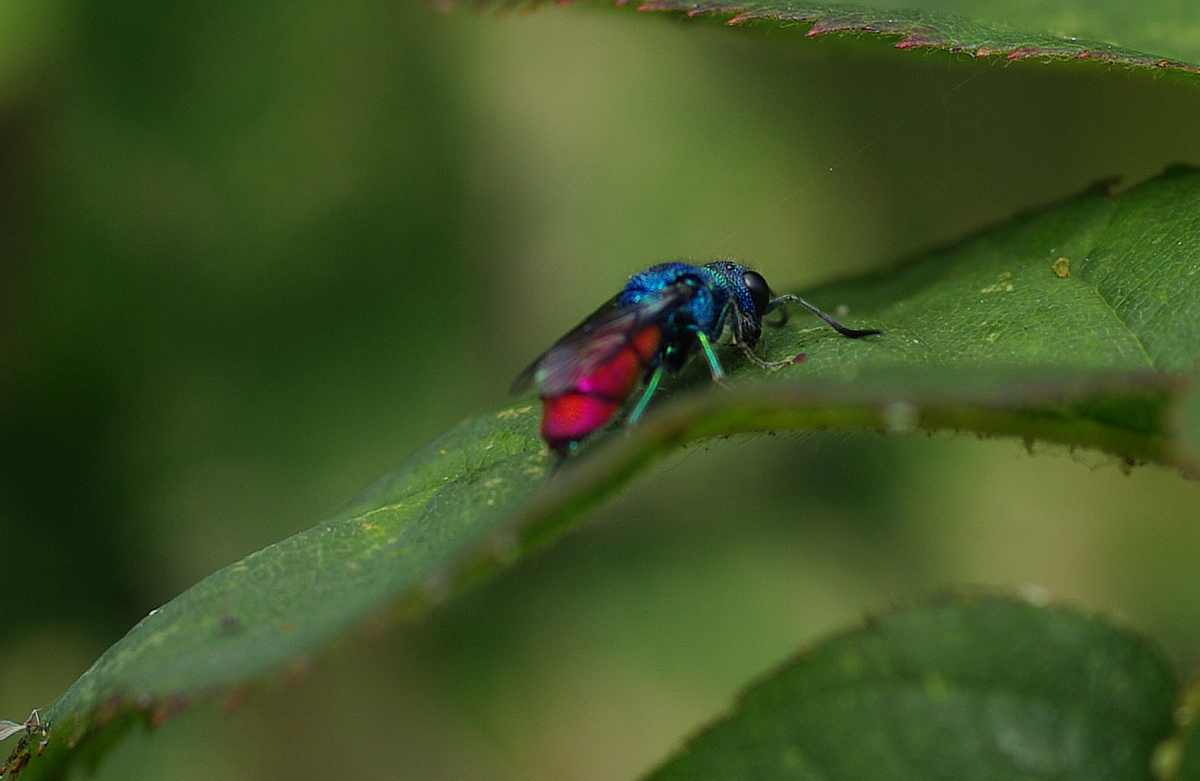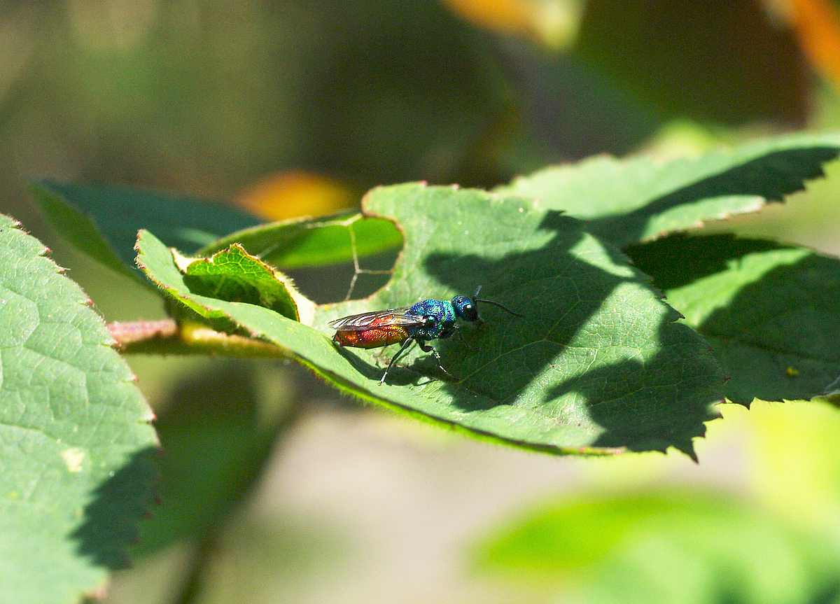 Думаю, это какой-то пилильщик. Никогда раньше не встречал таких ярких. Прилетали все время на один и тот же розовый куст, хотя их в этом месте растет 4 совершенно одинаковых куста.