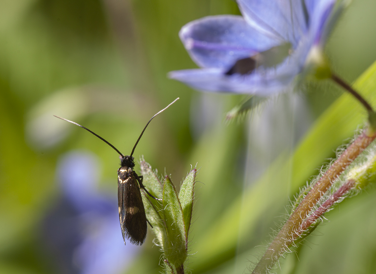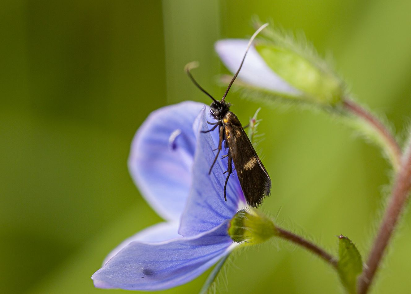 Счастливую пару молей встретил сегодня на веронике дубравной. Одна большую часть времени провела в цветке вероники, другая сто-то обследовала на соседних травинках.