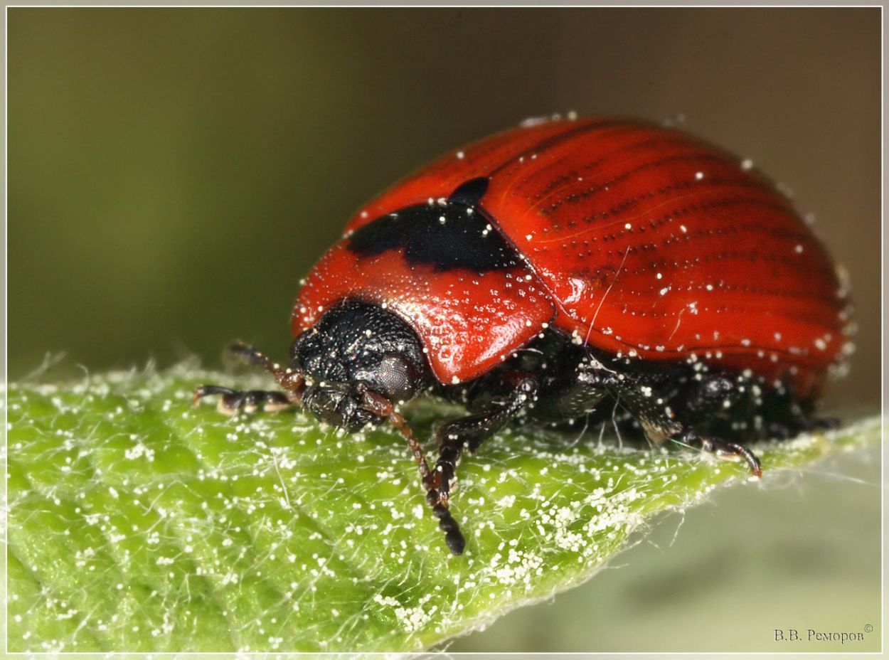 Потревоженные, они замирают и в следующий момент камнем падают в траву. Белые крупинки на жуке и на листьях - пыльца сосны