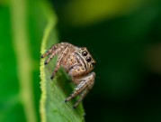 Вот этот крошечный скакун, которого вместе с лапками можно вписать в окружность диаметром 4 мм-тоже, своеобразный "индеец с тротуара", паук, но вполне домашний. Проживает у меня на подоконнике. Не голодает,похоже, судя по нескольким маленьким жертвам там же, на подоконнике. И вполне поддаётся лёгкой дрессировке, если это можно так назвать.
