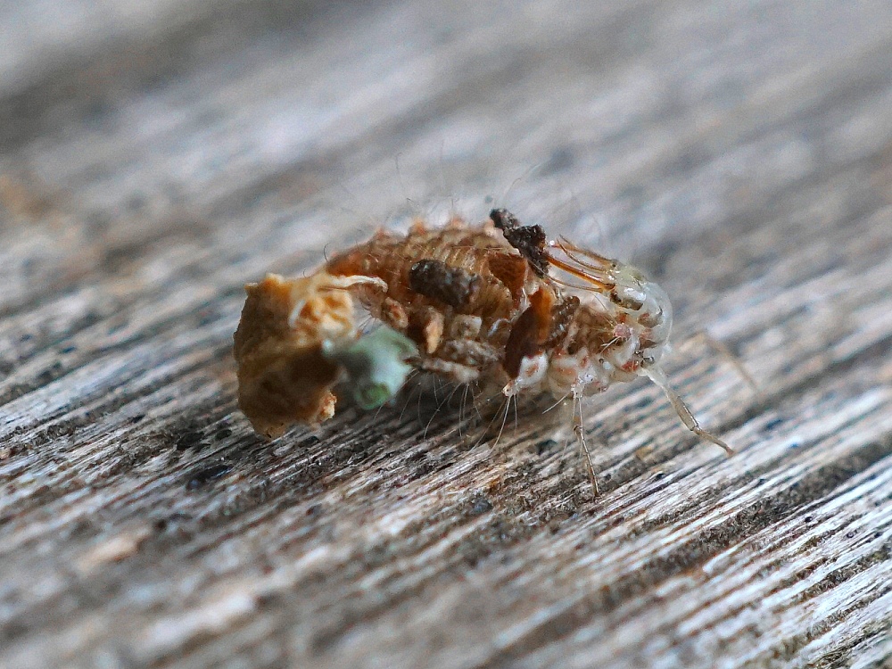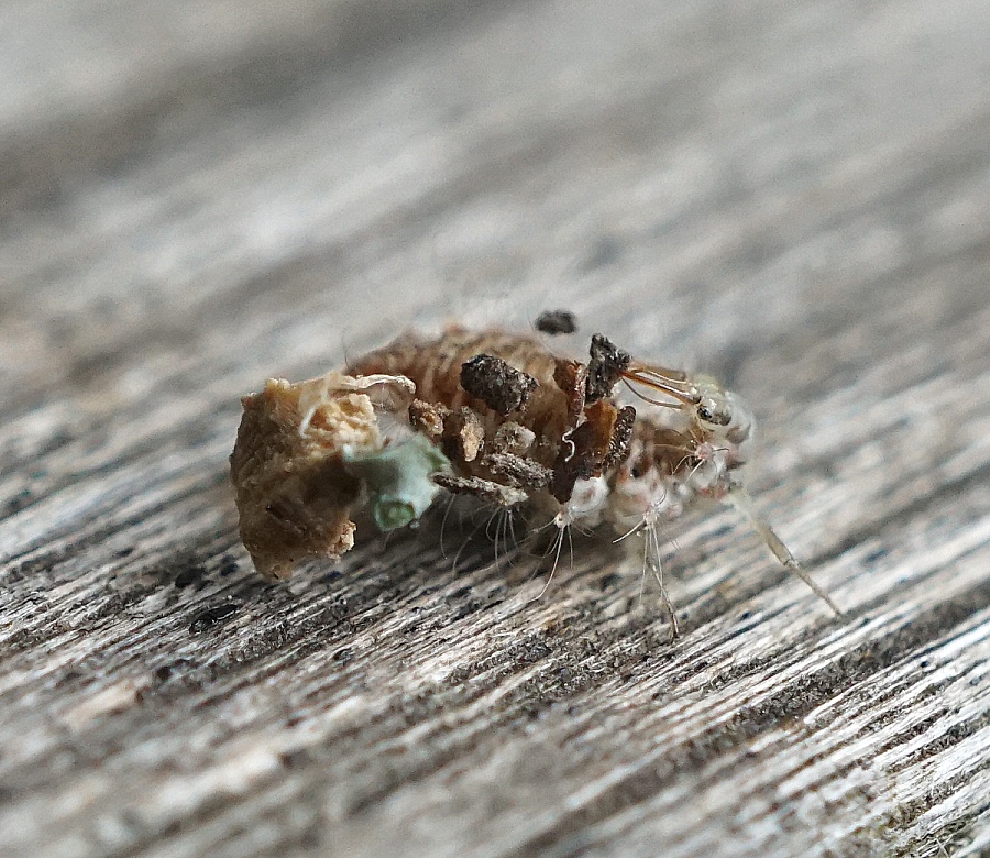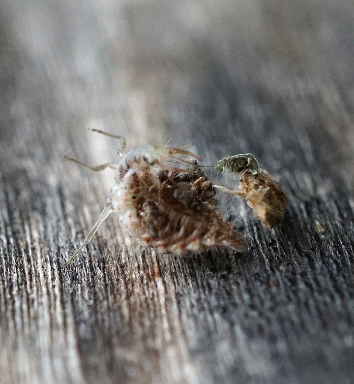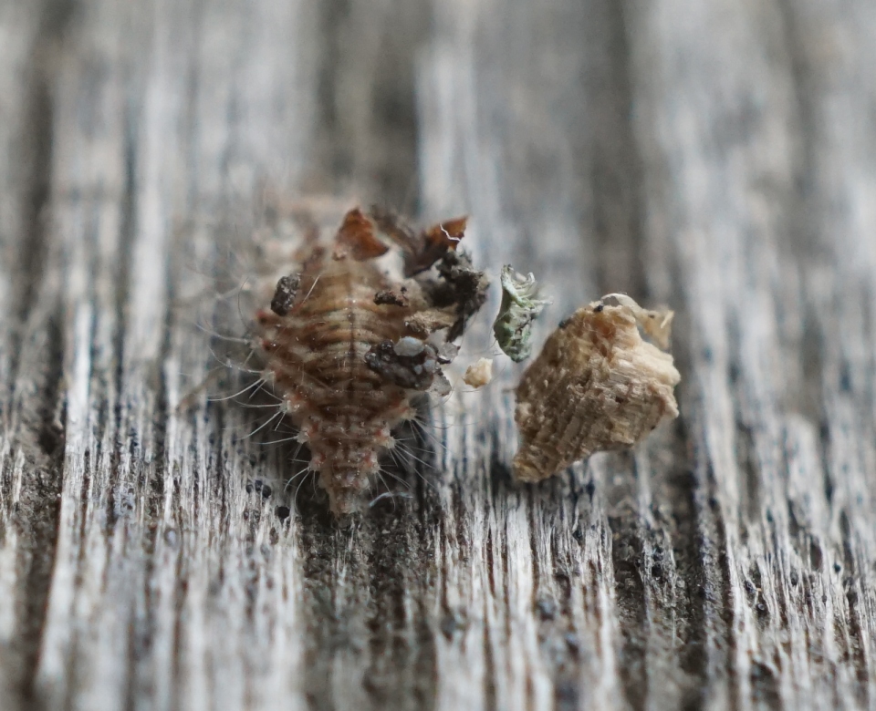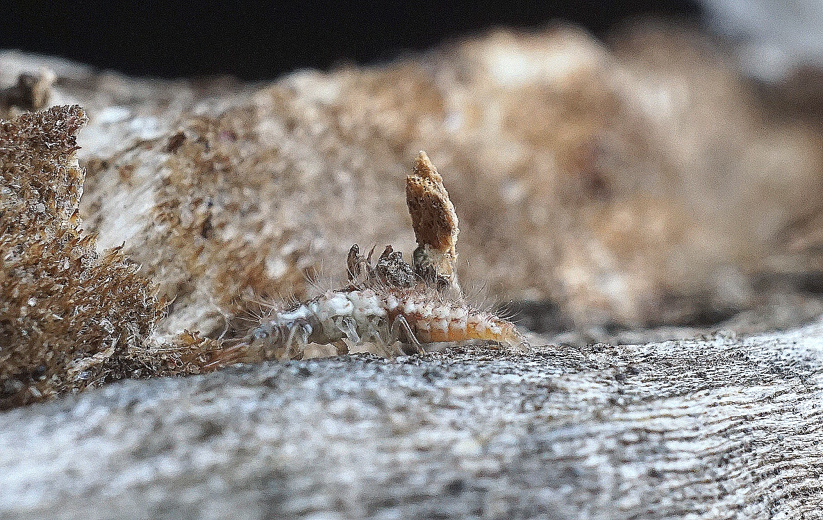 Ползло что-то мелкое по брукам. Без понятия пощёлкал фотиком. Похоже на личинку златоглазки. Жалко было просто смахнуть. Переставил на деревяшку. Снимая дальше, понял, что не угробил, но часть её запасов сползла со спины. Далее сделал несколько кадров на деревяшке. Дома понял, что самой личинке вред не был нанесён, т.к. она старалась восстановить свои запасы.