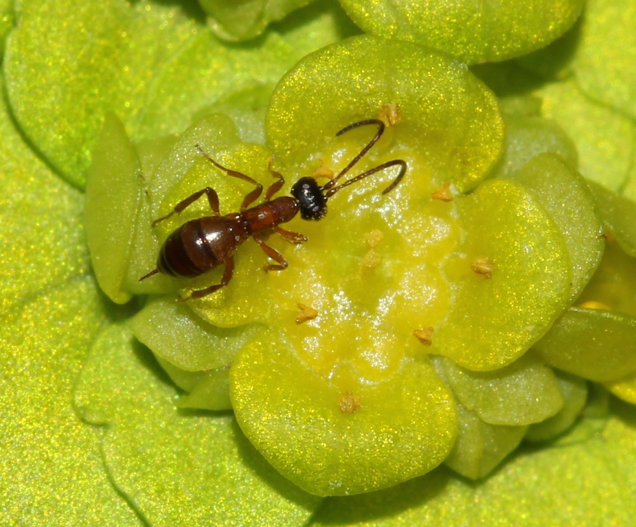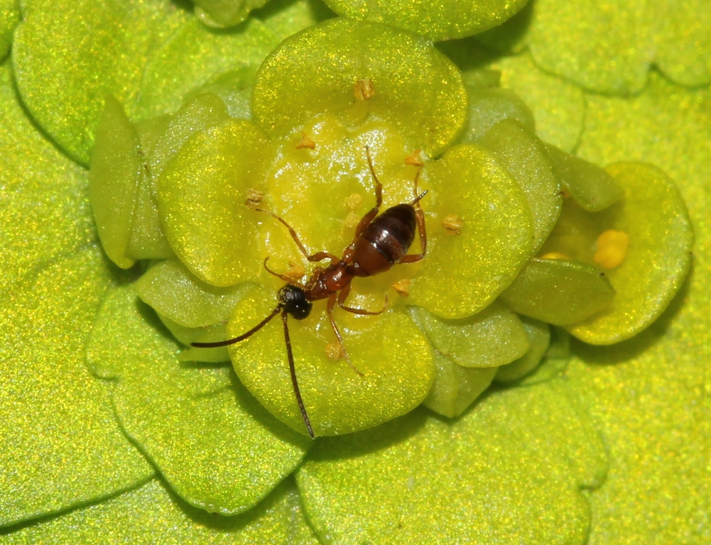 Бескрылый наездник из подсемейства Cryptinae семейства Ихневмонид (Ichneumonidae). Активно кормился на цветках селезёночника обыкновенного (Chrysosplénium alternifólium). Какой-то Gelis???
