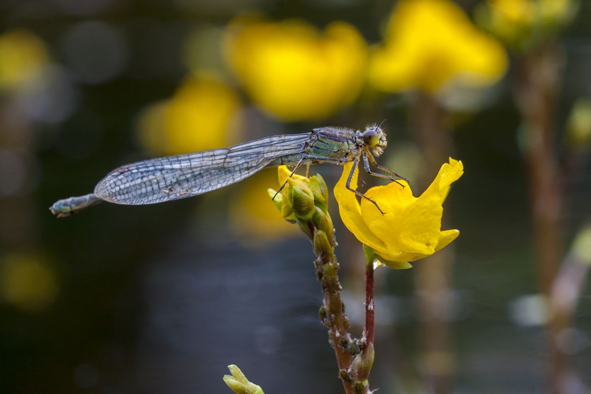 Самка стрекозы-лютки (Lestes ) на цветке пузырчатки высматривает самца для серьёзных отношений