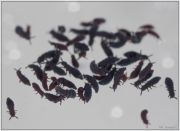 Появились первые проталины. В освещенном солнцем уголке поверхность лужи оказалась усеяна мелкими черными крошками. Оказалось, это мелкие коллемболы. Несмотря на ледяную воду, они были весьма активны, постоянно перемещались, собирались в группы, но на сушу не убегали. Нужной техники с собой не было, поэтому зачерпнул воды с поверхности и сфотографировал их уже дома. Размер их таков, что самая крупная при 5-кратном увеличении укладывается по длинной стороне кадра 4.3 раза.