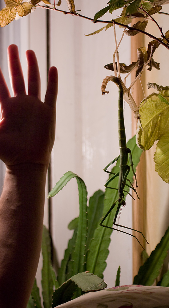 Слева на снимке моя рука, находится в одной плоскости с палочником, снимок - как факт и рука, чтобы представить размер.