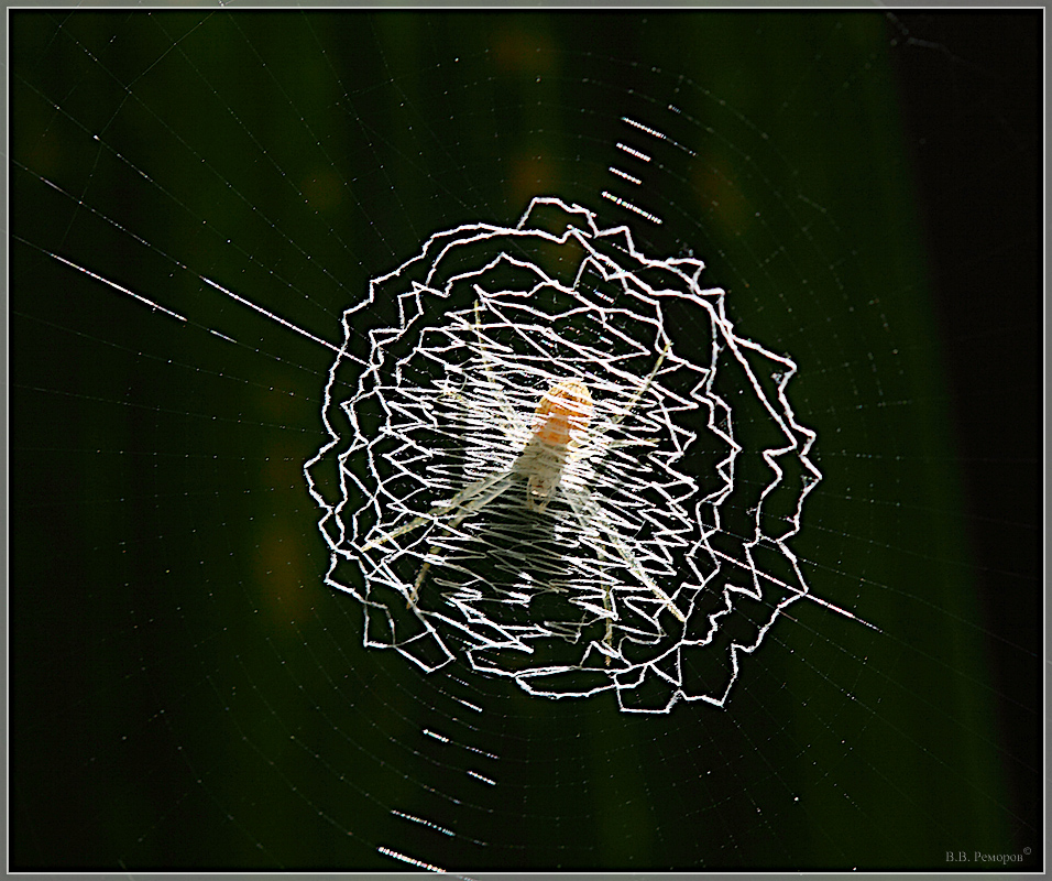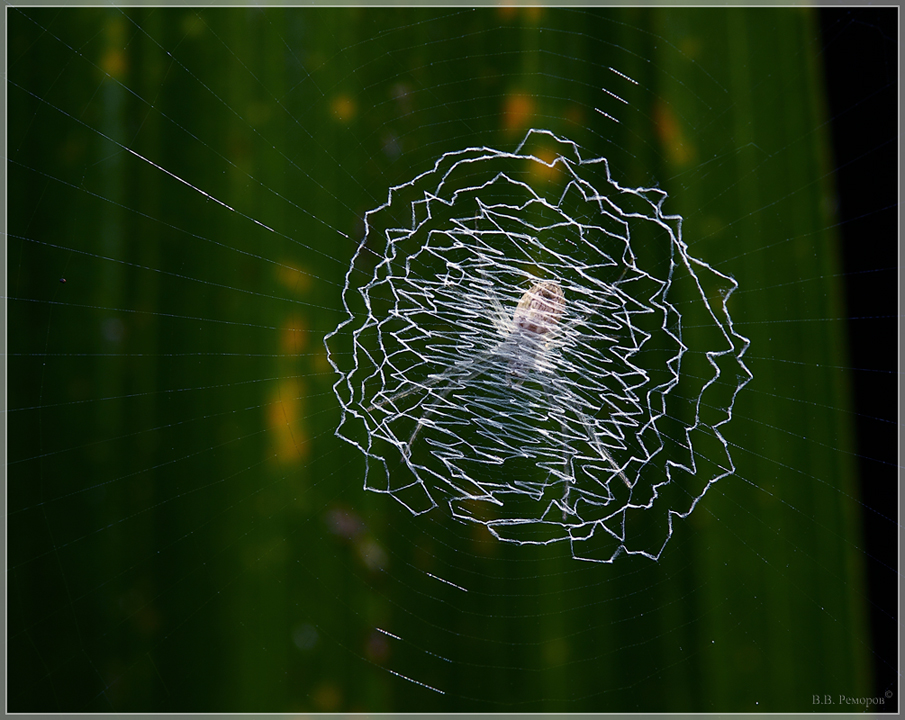 Там, где я был, пауков было немного. Наверное, вездесущие муравьи ограничивают и их численность. Маленький паучишка сплел свою сеть на сломленном листе кокосовой пальмы, склоненном к самой земле. Утром лучик света скользнул между густых ветвей и осветил паутинку и его, сидящего в укрепленном центре паутины. В клубе я встречал подобное плетение центра паутины (http://macroid.ru/search.php?searchid=64989), ну а насколько они похожи или, тем более - родственны (пауки), скажут специалисты.