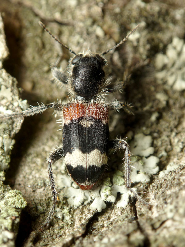 Пестряк пёстрый (Clerus mutillarius F.) Хоть он и пестряк, а спрятался на коре дубка так, что я еле заметил. Сначала сидел тихо, затем испугался и начал наворачивать от меня круги по стволу. Я за ним, он от меня. Но всё таки поймал я его, в лоб так сказать...
