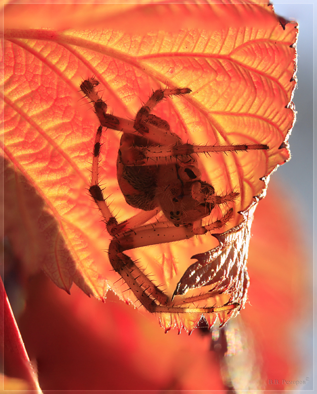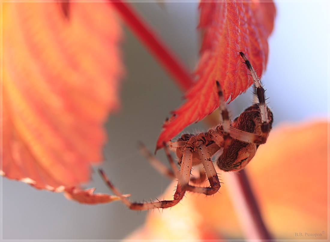 Вот один из последних пауков. Крестовик. Самец. Одинокий, он сидел на ветке малины с рубиново-красными листьями и прятался под ними от холода и ветра. Паутины рядом не было, да и кто бы в нее мог прилететь? На дворе уже поздняя осень.