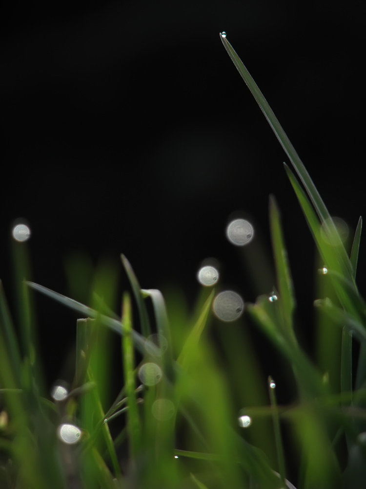 Травка у реки уже не такая зелёная и сочная, и насекомых почти нет. Зато капельки на самых кончиках травинок неизменно удивляют объектив:)
