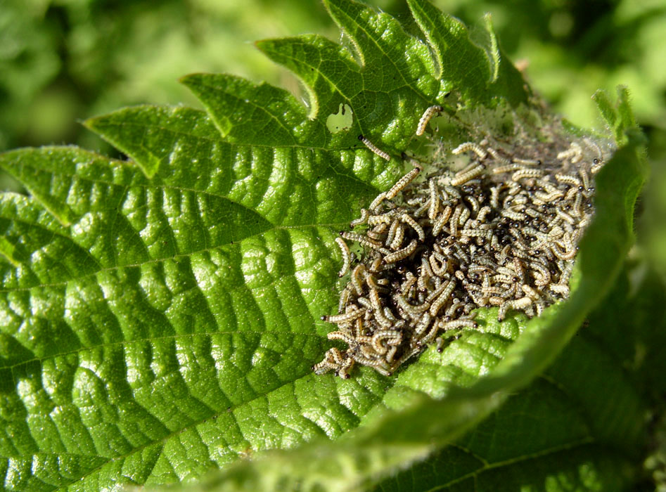 Со временем стенки "палатки" становятся толще и надежнее. По утрам, с восходом солнца, личинки прогрызают в ней дыры и выбираются на пастбище. Теперь их "зубы "окрепли, и они свободно расправляются с листьями крапивы, начиная поедать их по краям.