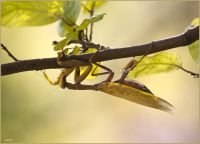 Утомленная солнцем и своим положением самка богомола спряталась в тень кроны дерева. Даже осенние мухи не отвлекали её от отдыха.