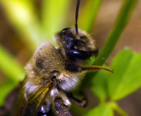 Скорее всего, это Andrena vaga (Panzer, 1799). Очень распространённый весенний вид, раньше всех начинает рыть норки. Если колония большая и место давнишнее (много лет), тот тут же можно поискать пчёл-кукушек (Nomada sp.), мух-жужжал (Bombilius sp.) и жуков-маек (Meloe sp.)