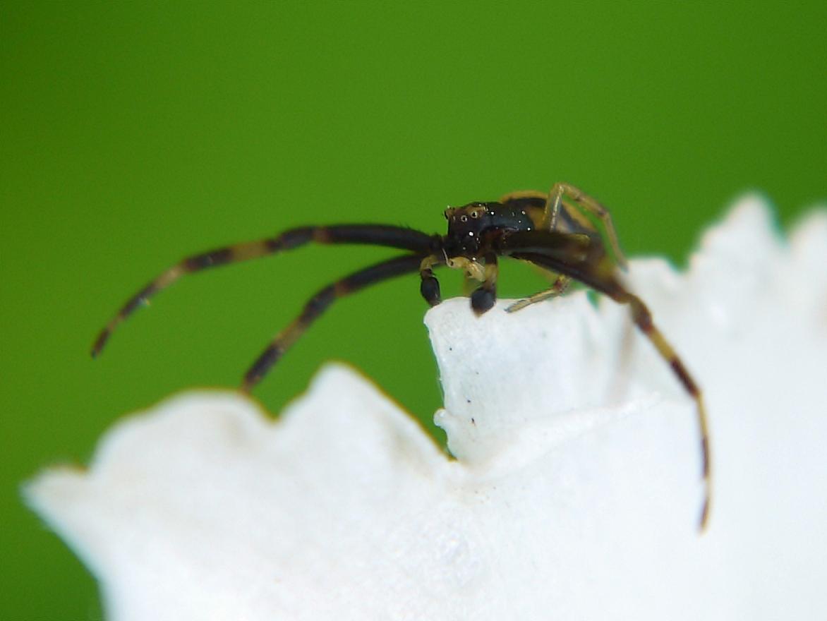 Он не паутину плетёт - это паук-бокоход, а они засадники, поджидают жертву, сидя на цветке или ещё чём-то высоком. Тут же самец так путешествует в поисках самки : залезает на самую верхотуру, потом выпускает длинную паутинку по ветру и ждёт, когда её конец прилипнет к другому высокому предмету. Затем по этой паутинке перебирается, как канатоходец через пропасть, и так далее...