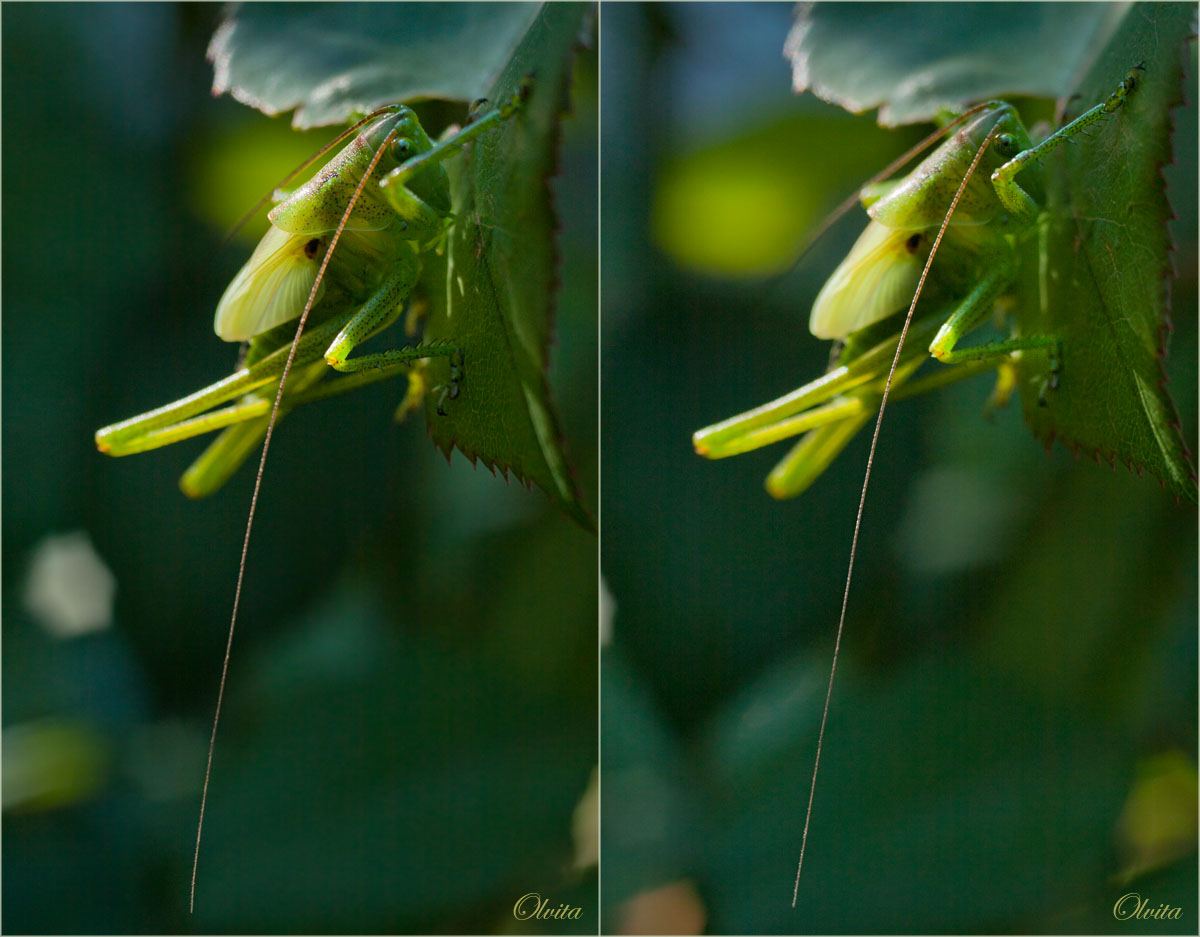 Максим Гуляев: А мне больше всего понравился второй снимок, именно отсутствием крупных резких деталей, общей мягкостью. Хотя конечно он композиционно и более традиционен (не путать с банальностью ). А на основном совсем немного напрягает только одно - широковатое пространство сзади кузнечика. Но я бы лично не стал обрезать, а совсем даже наоборот, добавил спереди пространство. Таким образом снимок сохранит свою оригинальность. А тональность легко подправить под любой вкус, тут уж дело сугубо индивидуальное. Вот.