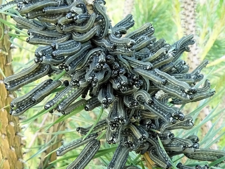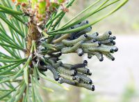 Огромное колличество гусениц обьедает молодые трех четырех метровые сосенки Их так много что одну иголку едят сразу три четыре гусеницы Самое интересное что периодически все они как по команде одновременно поднимают и опускают головы Как будто делают вдох и снова набрасываются на еду