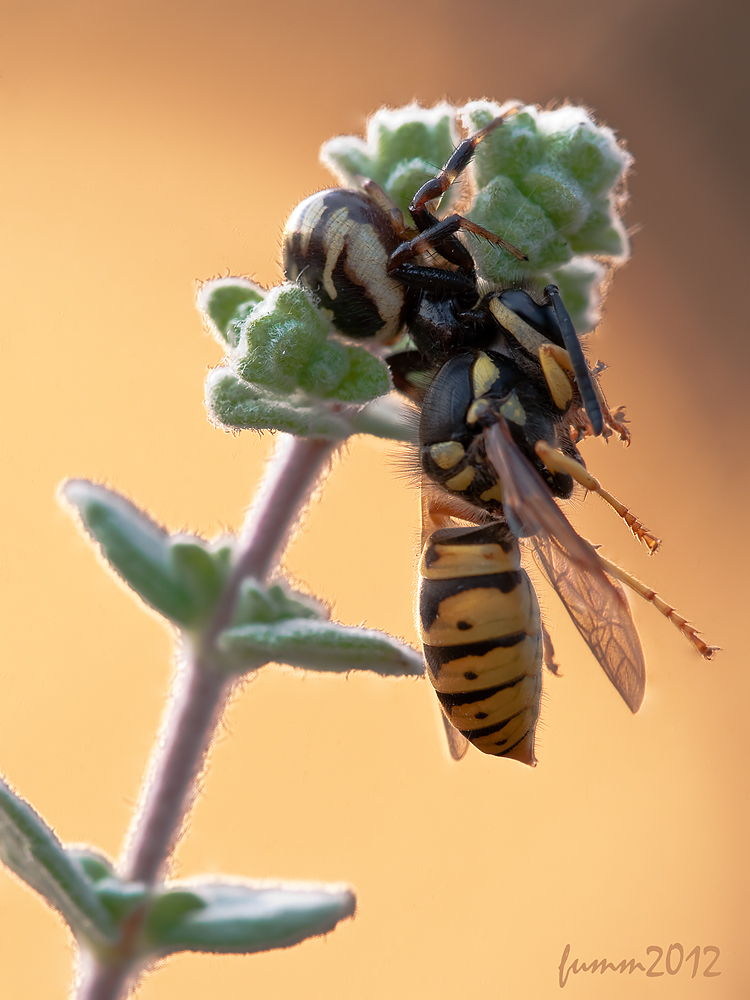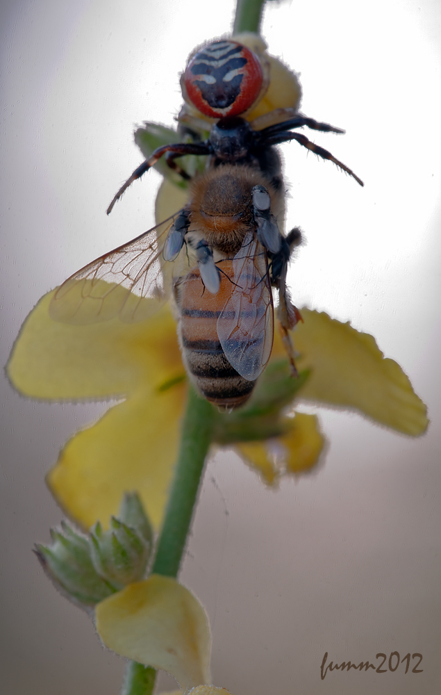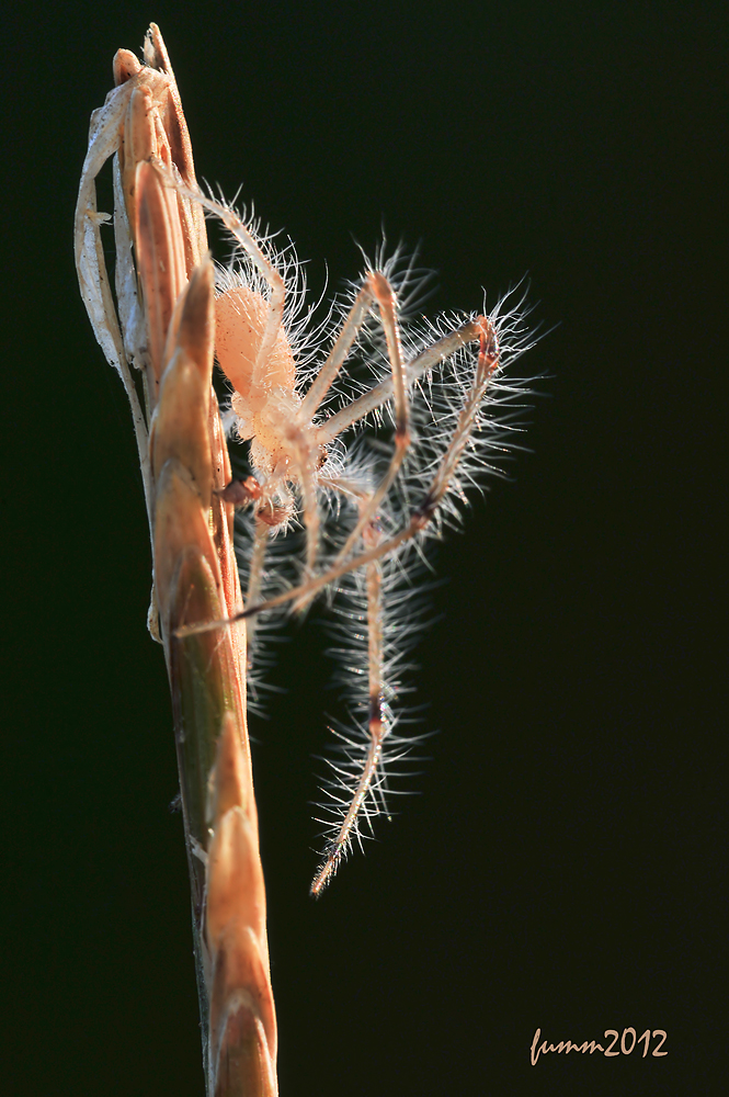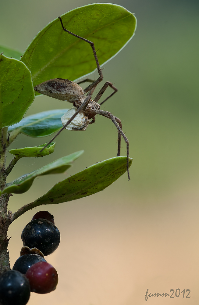 Удивительный паук: как с такими колючками на лапах можно двигаться , да еще и охотиться(он из охотников).А уж как мамочка-просто пример самоотверженности: ни за что не сдвинется с гнезда.В прошлом году полтора месяца наблюдал самочку на насесте,ожидая потомства.Потом приехал... один очень известный в прошлом МКшник и разодрал гнездо, чтобы похвастать кадром с малышами...Забыть не могу.