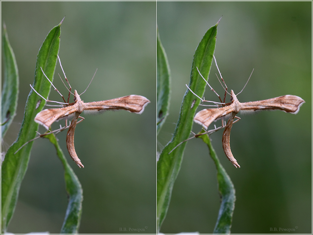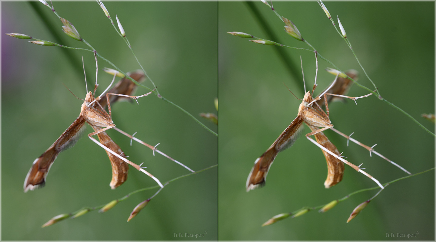 Ну как ее показать целиком и понятно? Она вся такая несуразная и неудобная для съемки, с растопыренными крыльями, брюшком и ногами занимает большой объем и требует большой ГРИП. Выход один - показать в объеме, а значит - в стерео!