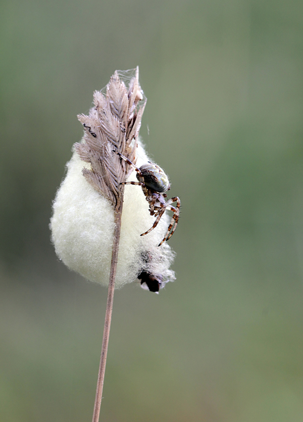 Я наблюдала за этой конструкцией пару дней, но так и не поняла, кто является хозяином этого дома, паучков было несколько маленьких и один побольше, он у меня попал в серию. Сначала гусеница была живая, на следующий день она уже не подавала признаков жизни.