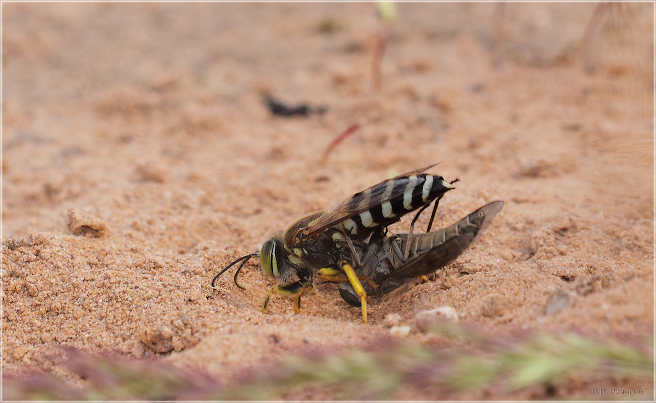 На фото мы видим процесс раскапывания, когда оса с силой бросает песчинки назад и они, быстро двигаясь, оставляют на матрице изображения в виде линий. Голова во время работы сотрясается вместе с быстро копающими передними ногами, поэтому тоже - смаз