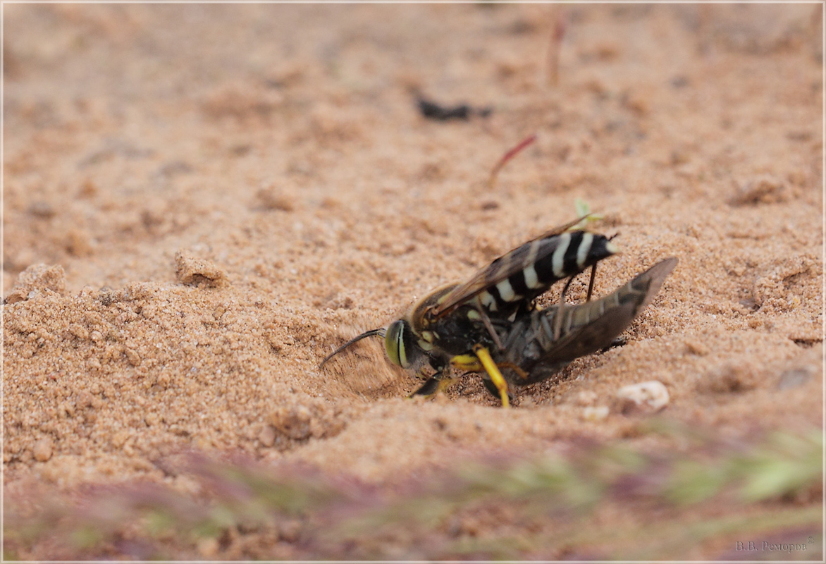Колония бембексов обитает на дне карьера, где добывают песок для строительства. Масштабы добычи невелики, поэтому на дне карьера много мест, где песок уже давно не трогали. Вот здесь-то и устраивают свои норки эти осы.