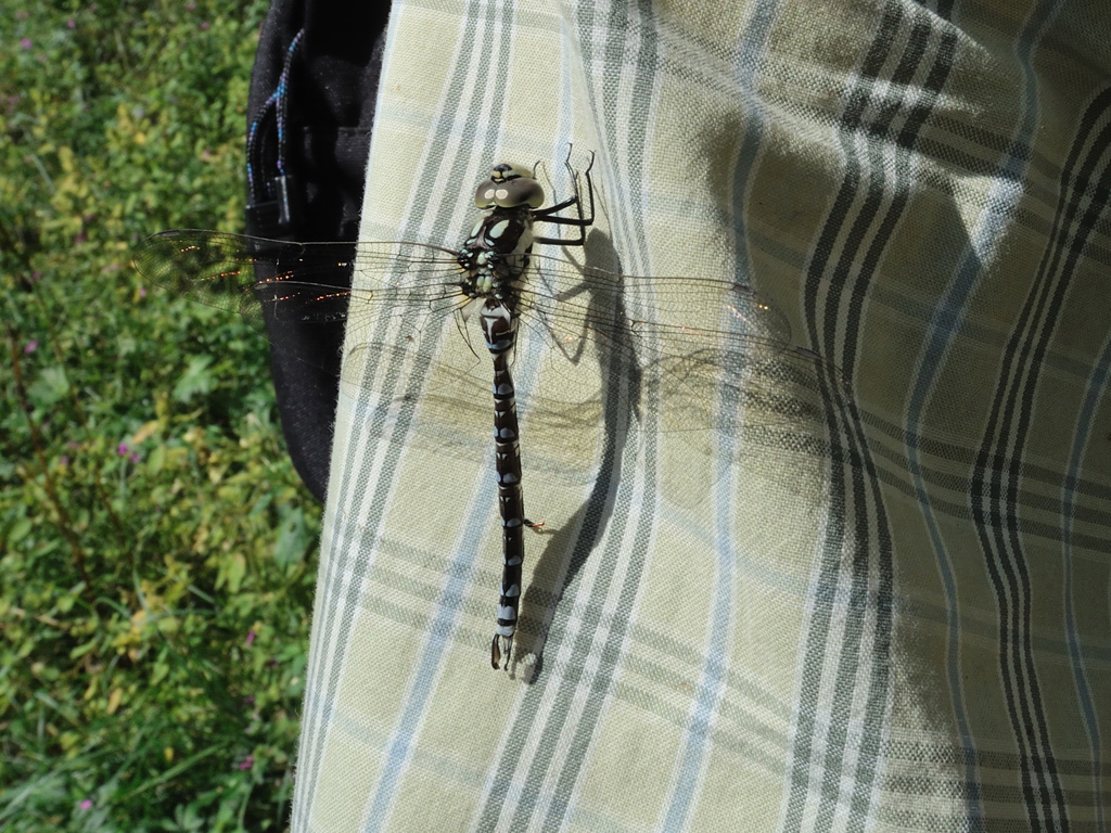 Он обогнал меня, а на обратном пути подлетел, посмотрел в глаза, и сел прямо на лоб, свесив хвост вдоль моего носа. Не удалось сфотографировать этот момент, видно моргнул пока, косясь на сумку, доставал фотоаппарат. Улетел ... А здесь фото, когда тоже самец aeshna cyanea сел на рукав. Тоже в Переделкино, и практически на том же месте.