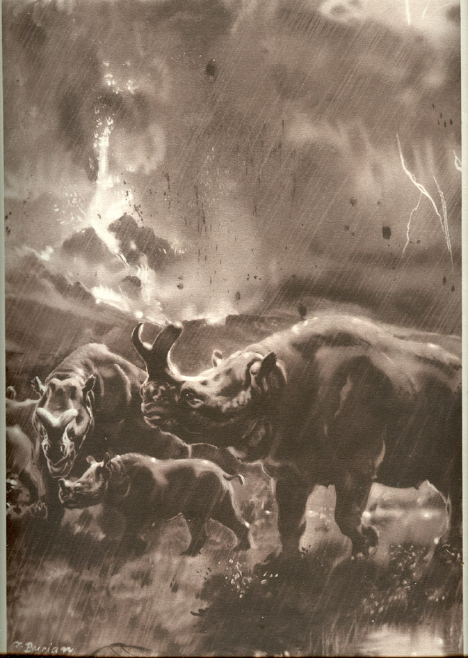 В тени юкковой рощи пережидает дневную жару стадо бронтотериев. Это один из очень крупных растительноядных на Земле. Самые крупные взрослые самцы достигают 3 метров высоты в холке и весят более тонны. Их нос украшен большим сердцевидным рогом, характерным для этого вида. Взрослые особи так велики, что могут не бояться местных хищников , однако стадо все же держится вместе, чтобы защищать молодняк. На снимке два взрослых самца охраняют подступы к стаду и им не нравится суетящийся поодаль непонятный субъект на двух ногах, периодически поблескивающий одним большим и круглым глазом.