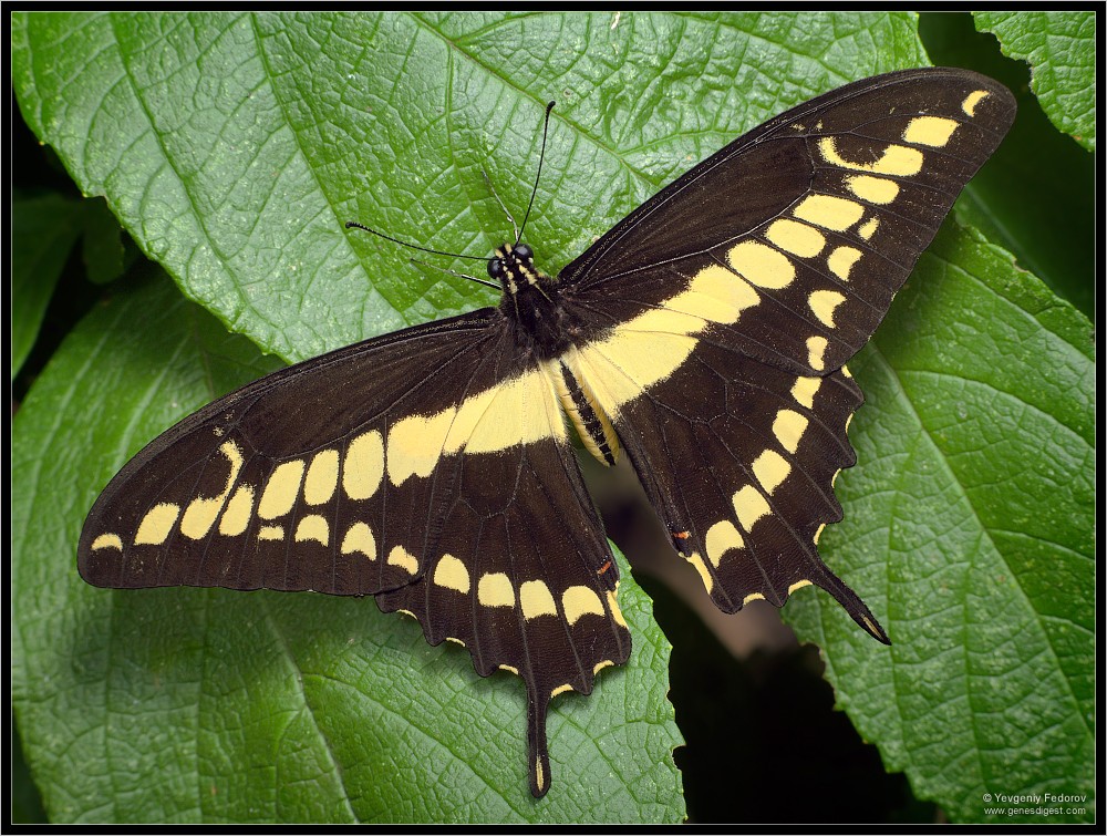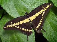 Нужно снова идти по просеке. Жара еще не началась, и здесь попадается несколько бабочек, сидящих на на придорожных кустах, распластав крылья. Удается сфотографировать красивого черно-желтого парусника, неподвижно греющегося на солнце. Пока снимаю его, из чащи, заставив меня остолбенеть, вылетает колоссальная коричневая бабочка, немногим меньше двадцати сантиметров в размахе. В то время как она проносится рядом со мной, обдавая ветром, парусник, как будто устыдившись своего размера (всего каких-то несчастных десять сантиметров!) складывает крылья за спиной. Гигантская бабочка тем временем на большой скорости делает круг над просекой, в несколько взмахов набирает высоту, поднимаясь над деревьями — и через пару мгновений исчезает за кромкой леса. Лишь теперь соображаю, что это была морфида — но не самец, а гораздо более редкая и крупная самка. Какой у нее поразительный полет — мощный, быстрый, уверенный... Это при таком-то размахе! Сомнительно, что самец со своим порхающим полетом способен догнать ее в воздухе — если она, конечно, сама ему не позволит.