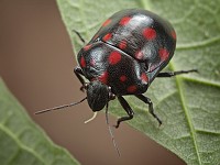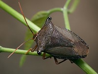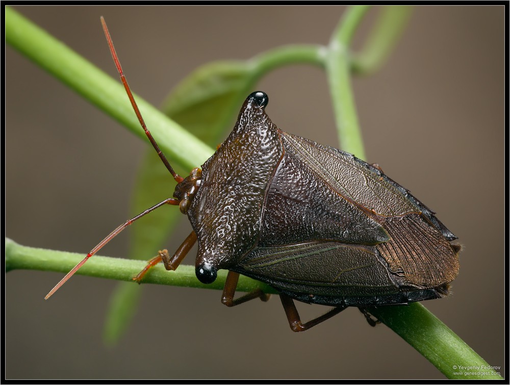 Через пятнадцать минут, как и предполагалось, со стороны озера раздается грохот. Вскоре мимо проносится весь моторизованный караван — на этот раз в противоположную сторону. Наконец можно спокойно заняться съемкой. Обмотав руку своей фотографической безрукавкой, срываю один из листьев с сидящим клопом и закрепляю в лошарике. По ходу выясняется, что футболка, в отличие от безрукавки, совсем не защищает от иголок — то и дело чертыхаюсь и дергаюсь, когда очередное растение прикасается к плечам или спине. Клопик, сидевший до этого неподвижно, вдруг обретает прыть и то и дело пытается перебежать на сторону листа, противоположную от меня — приходится постоянно крутить лист в зажиме. После десяти минут такой фотосессии сдают нервы и я, ругаясь и почесываясь, выбираюсь из негостеприимных зарослей. К этому моменту почти вся спина и плечи покрываются зудящими волдырями.