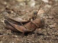 Следующий объект «двойной»: прямо на дороге сидит парочка кобылок, почти сливающаяся по цвету с субстратом. Маленький самец гордо взобрался на спину самки, как будто в седло. У его партнерши, к сожалению, отсутствует левая прыгательная нога, поэтому ракурс выбирать особо не приходится. Интересно, что оба — и самец, и самка — имеют лишь зачаточные крылья, и тем похожи на личинок старших возрастов. А может, это и есть личинки? Тогда почему они себя так по-взрослому ведут? Куда смотрят родители?.. Пока я размышляю над всем этим, парочка упрыгивает в кусты на обочине, вероятно, чтобы продолжить общение в более интимной обстановке.