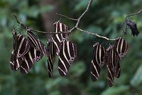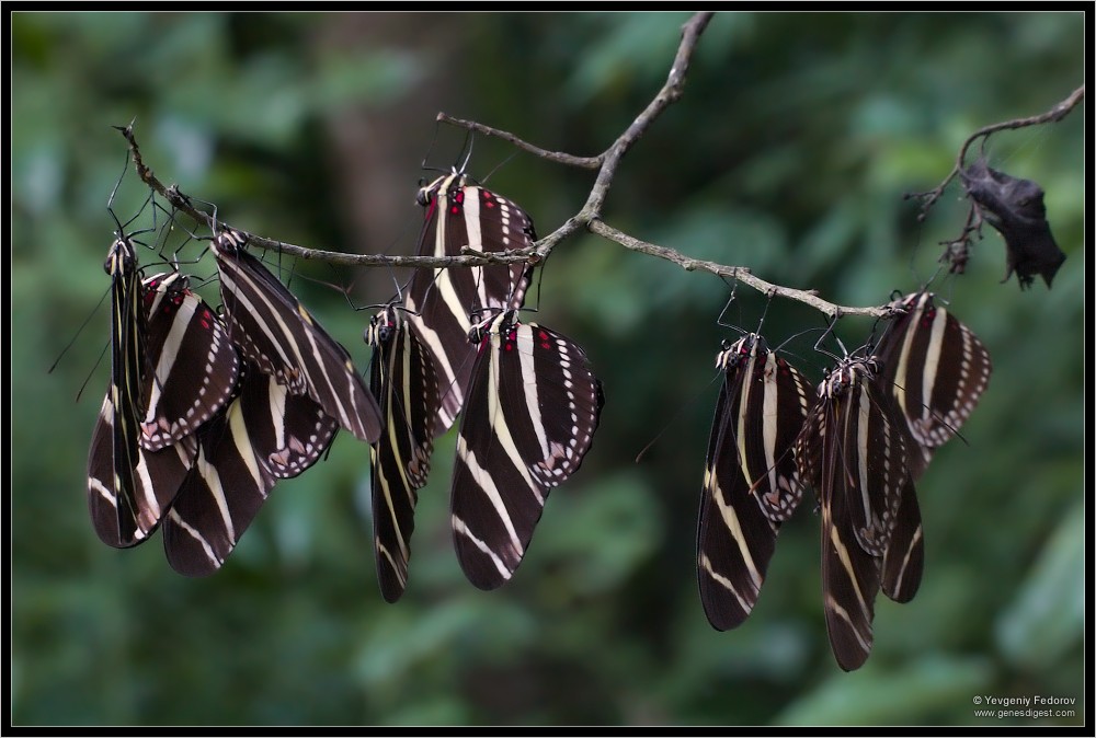 Кое-как, все еще под впечатлением от пережитого ужаса, добираюсь до кустика с геликонидами. Еще темно, и бабочки висят неподвижно. К сожалению, дует слабый ветерок, заметно колышущий ветки, а лошарик тут неприменим: слишком велик риск спугнуть. Помня свои неудачные попытки, раскладываю штатив максимально осторожно. Наконец фотоаппарат закреплен и нацелен на самую фотогеничную, с моей точки зрения, веточку. Фонарик помогает навестись на резкость. Приходится сделать очень много кадров, чтобы увеличить шанс попасть между порывами ветра. По мере того, как светает, выдержку можно постепенно уменьшать — но зато, увы, ветер становится постоянным и заметно усиливается. К тому же некоторые бабочки начинают просыпаться и ерзать на месте. Дальше снимать уже бесполезно...