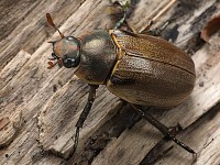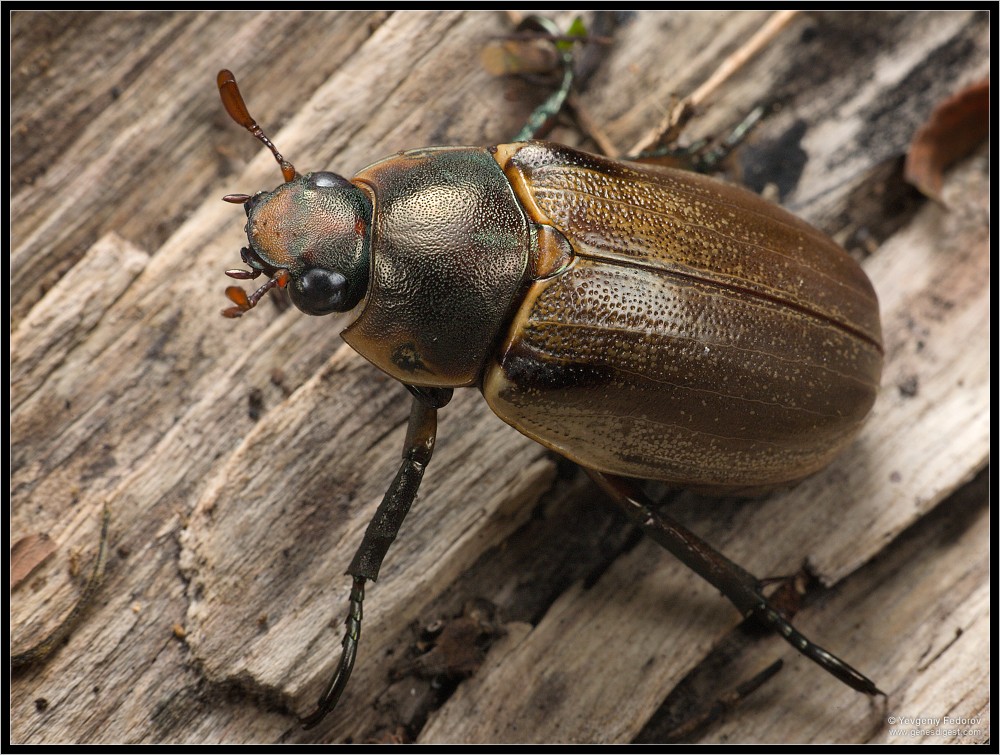 По мере продвижения вглубь леса попадаются новые объекты — в основном, конечно, клопы. Надо снимать всех подряд, даже тех, кто попадался раньше: чем больше кадров, тем больше шанс потом найти среди них приличные. Но вот обнаруживается и кое-что новенькое: на уже знакомом растении с жалящими муравьями сидит довольно крупный пластинчатоусый жук. Интересно, почему муравьи его не трогают? Заметив наведенную на него камеру, жук разжимает лапки и падает вниз. Удается его найти — вот он лежит на куске коры, сложив лапки вдоль тела. Наверное, считает, что притворился мертвым, однако его выдают его с головой торчащие растопыренные усики. Через минуту жук и сам понимает, что актер из него никудышний и никого обмануть не удалось — резко встает на дыбы и тут же улетает.