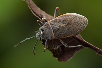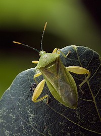 Во время обхода озера по периметру никаких достойных макрообъектов не попадается. Когда вновь выхожу на дорогу, встречаю очередного клопа, не виденного раньше, на этот раз зеленого и полупрозрачного. Сколько же видов их здесь, в самом деле! Клоп вскоре улетает, позволив сделать около десятка кадров. Сегодня, к счастью, нет необходимости прислушиваться к шуму вездеходных моторов: у Момо выходной. На обратном пути вновь задерживаюсь у знакомой осиной норы. Самой осы нигде не видно, но тарантула тоже нет на месте — вероятно, его уже втащили внутрь. Во всяком случае, хочется верить, что на этот раз добычей завладела истинная хозяйка.