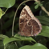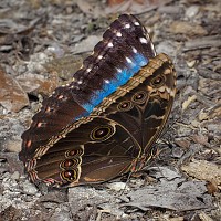 Первое насекомое, которое я в этот раз вижу прямо под ногами — сидящая морфида-самец. Неужели все-таки выпала под конец удача? Осторожнейше подкрадываюсь, навожу камеру... Щелк! Освещенная вспышками, морфида тут же взлетает. Ну чего боишься, дурашка? Ну присядь же еще на минуточку... ну пожалуйста. Бабочка, как будто сжалившись надо мной, садится на куст. Ну точно, как первая, которую мне удалось заснять три дня назад... Эта точно так же сворачивает и разворачивает хоботок, от которого на лист отлетают какие-то беловатые крошки. И фон, точно так же, оставляет желать лучшего... Но, как и в первый раз, выбирать мне не приходится. По крайней мере эта морфида, в отличие от тогдашней, целая, лишь поцарапанная. Стараюсь прицелится как можно точнее и нажимаю спуск. Щелк! Увы... Бабочка не дает шанса сделать третий кадр и тут же упархивает в чащу. Очевидно, придется довольствоваться тем, что уже снято. Спасибо и на этом.