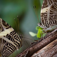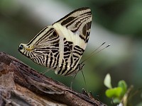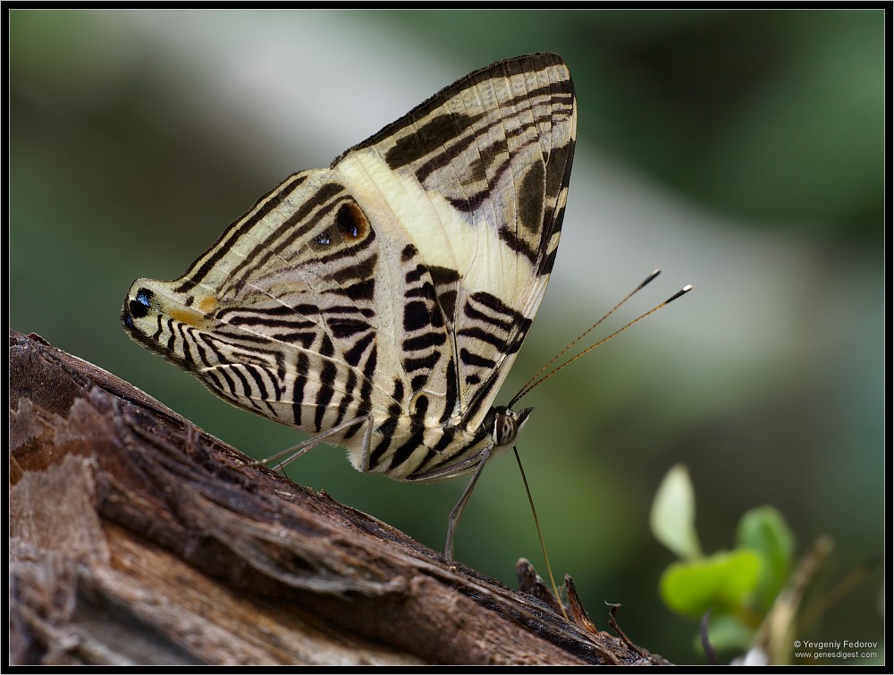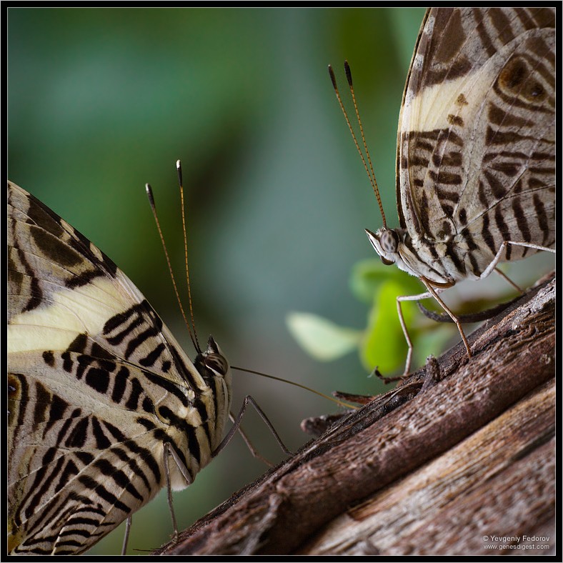 Сворачиваю с дороги вбок на тропинку, ведущую к озеру. В поле зрения попадает сидящая на сломанном стволе дерева красивая бабочка, напоминающую рисунком своего испода крыльев то ли тигра, то ли зебру. Бабочка питается, засунув хоботок в трещину коры — там, наверное, вытекает сок. Она никак не реагирует на вспышки, но кадры, полученные таким способом, довольно ужасны, в чем я убеждаюсь, посмотрев превьюшки на камере. Попробуем-ка со штатива... Вот теперь другое дело! Фотосессия занимает больше часа. Бабочка часто замирает совершенно неподвижно, позволяя снимать с самыми различными установками камеры. Через некоторое время на ствол садится точно такая же бабочка и делает попытки добраться до сладкого, отпихивая первую. Та крепко держится за свое место, и, не вынимая хоботок из щели, вовсю отмахивается усиками от конкурентки, иногда делая попытки «сдуть» ее резкими одиночными взмахами крыльев. Вторая временно отступает, но через пару секунд снова пытается подобраться, уже с другой стороны...
