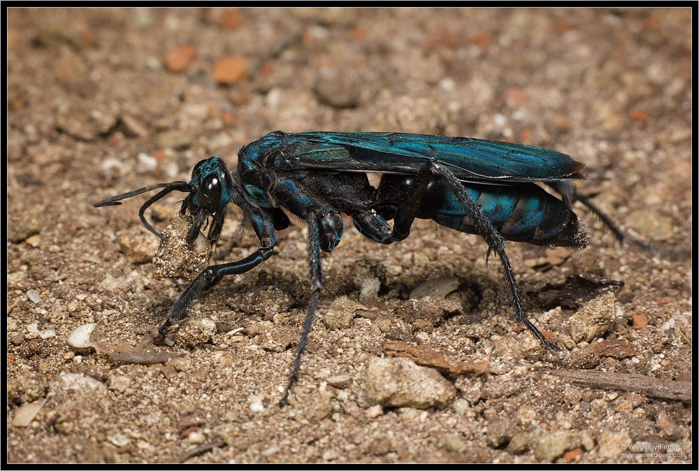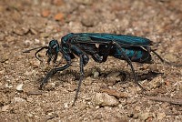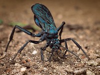 Во время этого морального самобичевания сам не замечаю, как оказываюсь на дороге, ведущей к озеру. Тут же из-под ног взлетает знакомая синяя оса. Упущенные морфиды забыты мгновенно. Ага, значит, эти осы все-таки иногда садятся! Обидно, что я ее спугнул, не заметив — хотя, с другой стороны, кто мог предполагать... Продолжаю путь осторожно, утроив внимание к дороге. И всего через несколько метров — небывалое везение. На дороге еще одна оса. Этот экземпляр — один из самых крупных, в длину около шести сантиметров. Оса явно занята чем-то важным: рыскает из стороны в сторону, время от времени начинает копать, бросает, перебегает на несколько сантиметров и снова копает... Тихо-тихо переступая, стараясь не дышать, подхожу к ней и делаю несколько кадров издалека. Ура! Хоть можно будет потом узнать, кто она такая.