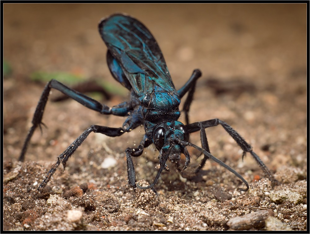 Постепенно и плавно приближаясь, удается подкрасться совсем вплотную. Аккуратно ложусь на дорогу, прямо в пыль. Навести фокус непростая задача: объект постоянно в движении. Приходится все время снимать с упреждением. Оса настолько занята, что почти не обращает на меня внимания, однако смысл ее бурной деятельности остается загадкой. Она то начинает копать грунт, то хватает челюстями валяющиеся на дороге камешки и веточки и перетаскивает их на несколько сантиметров в сторону, то заглядывает под сухие листики, то зачем-то кусает корешки травинок, то вновь отбегает в сторону и начинает рыть на другом участке... Несколько квадратных дециметров дороги уже напоминают вспаханное поле. Никаких норок поблизости не видно. Оса явно не занята строительством жилья, иначе копала бы в одном месте. Что же она делает, в таком случае — охотится? Кто же здесь может быть достойной добычей для такой громадины? Будучи не в состоянии ответить на эти вопросы, делаю все, что могу в такой ситуации: снимаю, снимаю, снимаю до тех пор, пока не разряжаются аккумуляторы во вспышках. Приходится подняться с дороги, чтобы заменить их на свежий комплект. Случайно моя тень падает на осу, та мгновенно вскидывается на дыбы и, раскрыв жвалы, приподнимает крылья. Такой прозрачный намек, учитывая ее размер, никак нельзя оставить без внимания, и я отступаю на шаг. Оса не возвращается к прерванной работе: как будто убедившись в ее бесплодности, она тяжело взлетает и перемещается по воздуху метров на десять вдоль дороги. Приземлившись, тут же исчезает под землей: оказывается, там вход в нору, очевидно ее собственную.