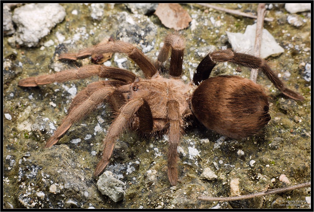 Ответ на мучивший меня вопрос обнаруживается на обочине. Здесь лежит, и по первому впечатлению, отдыхает, огромный мохнатый паук (птицеед?). Вначале я осторожно подкрадываюсь к нему, чтобы не спугнуть, но быстро выясняется, что спугнуть его уже невозможно: паук не мертв, но полностью парализован. Кто же умудрился обездвижить такого гиганта? Да вряд ли же кто-то еще, кроме синей осы. Здесь двух мнений быть не может. Сопоставляю наблюдения, и наконец вырисовывается довольно правдоподобная, на мой взгляд, картина.