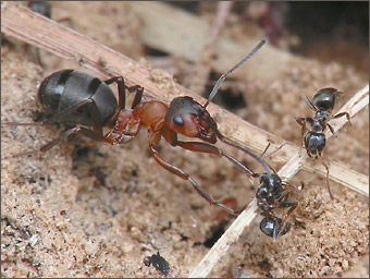 Рыжие лесные - более крупные и сильные муравьи. Им не составляло особого труда схватить мелкого садового и отнести его к себе в качестве добычи. Однако не всегда им сопутствовала удача. Черные садовые применяли интересную тактику… Садовый один на один не сдюжит с лесным. Но это если один на один, а если не один? Тактика садовых меня просто поразила. На лесного набрасывались сразу 5-6 чело... (оговорился) муравьев. Причем действия их не были хаотичными. Такое ощущение, что они знали, что делают. Муравьи растянули лесного за ноги и усы таким образом, что он уже не мог воспользоваться своими страшными челюстями и подогнуть брюшко, чтобы брызнуть кислотой… И эти действия оправдали себя с лихвой. |