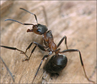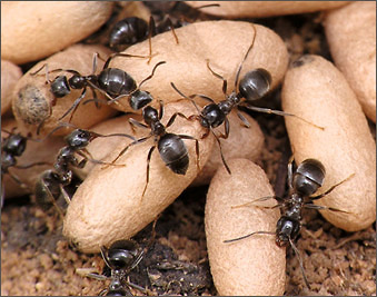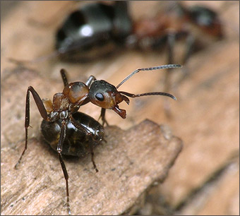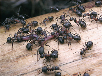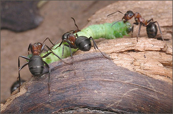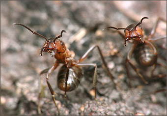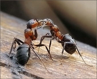 - Конечно! И постоянно делимся пищей. Причем при взаимном кормлении муравьи распределяют не только основные питательные вещества, но и ферменты, гормоны. Те, кто наелся до отвала, приносят остатки еды в зобе для раздачи ее другим муравьям. Голодный муравей, приблизившись к насытившемуся, просит у него еды следующим образом: он поворачивает голову на 90 градусов, раскрывает челюсти и, подставив их под челюсти сытого муравья, начинает поглаживать его усиками. Когда сытый все же отказывается дать еду, проситель слегка изгибается и поворачивает голову уже на 180 градусов. Если смысл первой просьбы, пользуясь человеческими словами, можно передать как “Дай поесть!”, то вторая просьба имеет усиленный характер: “Очень прошу: дай поесть!”. |