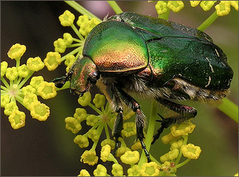 - Это зеленые блестящие жуки, которые в шиповнике любят сидеть? - Хм, зеленые! Не просто зеленые. Поснимай их с максимальным увеличением. Тогда ты сможешь разглядеть их рельефный узор. Кто-то даже сумел прочитать слово «золото», написанное на надкрыльях бронзовки золотистой. Правда я думаю, что это «притянуто за уши», исследователю очень хотелось увидеть эту надпись, но это не важно, помечтать и пофантазировать очень полезно и интересно! На самом деле жук черного цвета, но микроструктуры его покровов, преломляя и разлагая свет, создают игру световых лучей, и жук переливается изумительными красками! - Обязательно попробую. Продолжай пожалуйста… |
