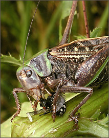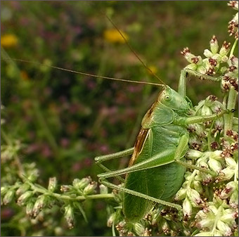 На растении сидел огромный кузнечик и с явным удовольствием уплетал огромную муху. - Все нормально, ведь кузнечики хищники, а саранчовые растительноядные. - А как же тогда песенка «…он ел одну лишь травку, не трогал и козявку и с мухами дружил»? - Спроси у автора. Очередная энтомологическая ошибка в человеческом творчестве. Кузнечик закончил свою трапезу и чуть переместившись по стеблю завел свою знакомую с детства песню. Трепещущие крылья издавали оглушительный звук. Через некоторое время он замолчал. Но после короткого перерыва вновь начал стрекотать. Сначала движения крыльев были медленными и я слышал редкое «цикание». Но, вот движения крыльев стали чаще и быстрее и полилась непрерывная песня! |