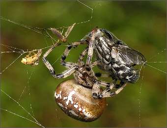 Дальнейшие события развивались очень быстро. Паучиха выбежала на путину на своих мохнатых ногах и мгновение спустя набросила на жертву первые петли и, умело поворачивая ее задними ногами, начала пеленать, затем изловчившись, нанесла смертельный укус мухе, не уступавшей ей в размерах. Затем быстро- быстро начала упаковывать свою добычу дальше. Вскоре муха стала похожа на мумию. - И что же дальше, как она будет ее жевать? |