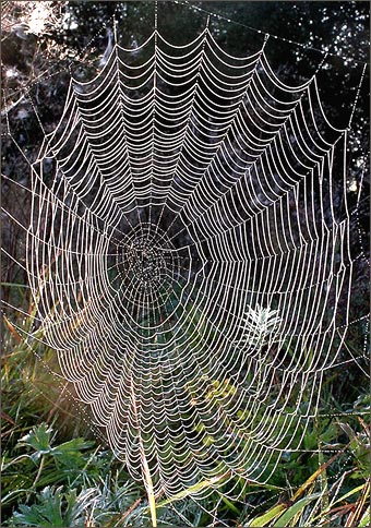 Я с любопытством стал рассматривать паутину, которую сплела эта известная ткачиха. Ловчая сеть была просто великолепна. Но, тут я обратил внимание, что толщина паутинных нитей не одинаковая, да еще и спиральные нити почему то в капельках. - А что это за капельки на паутине, роса что ли? - Нет, просто у паучихи, ведь в путине ты видишь самку паука, различные железы вырабатывают различный тип нитей. Основа и радиусы она делает из толстых, сухих нитей, а вот спиральные нити она делает из более тонких нитей, покрытых специальным липким, не застывающем на воздухе секрете. Он через некоторое время собирается в капельки. Именно эти капельки и приклеивают к паутине добычу. - А паучиха не прилипает, потому что бегает по сухим нитям? - Естественно. Периодически ей приходится ремонтировать свою сеть. Ветер, животное, человек, могут легко порвать ее. Кстати, порвать паутину- к несчастью. Хотя паутина очень крепка! - Ну, чего в ней крепкого! Такая тонюсенькая. Хотя, мне попадалась какая-то информация, что из нее даже пытались сделать ткань. - Попытки изготовления ткани из паутины делались с давних времен. Исключительная по прочности, легкости и красоте ткань из паутины известна в Китае под названием «ткани восточного моря». Полинезийцы употребляли паутину крупных тенетных пауков в качестве ниток для шитья и плетения рыболовных снастей. |